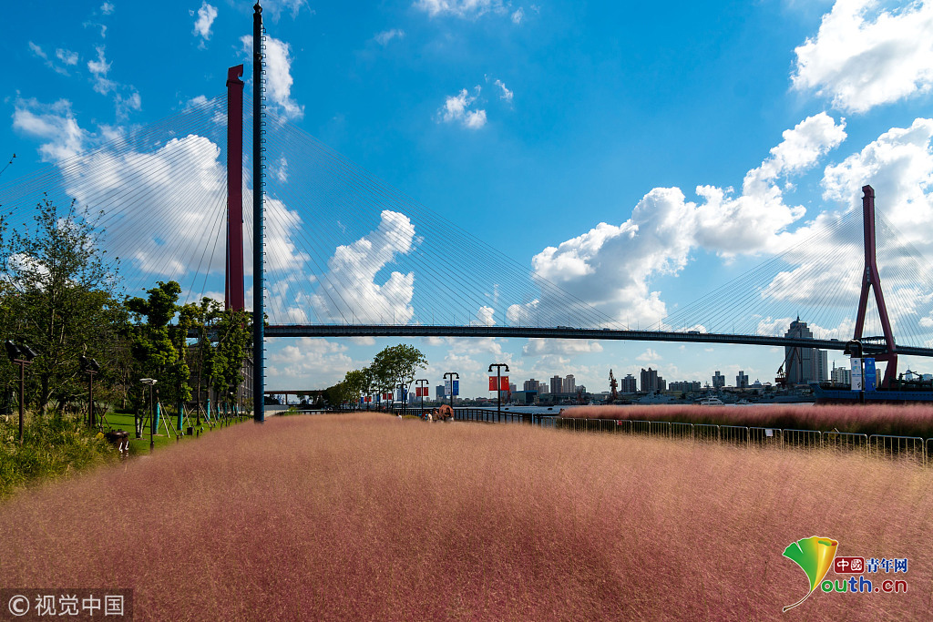 2018年9月28日,上海,東外灘楊浦濱江的粉黛亂子草目前已進入盛花期,當(dāng)日早間,不少市民來到濱江拍照賞景,成片的紫色花海在藍天白云映襯下美不勝收。圖片作者:王岡/視覺中國