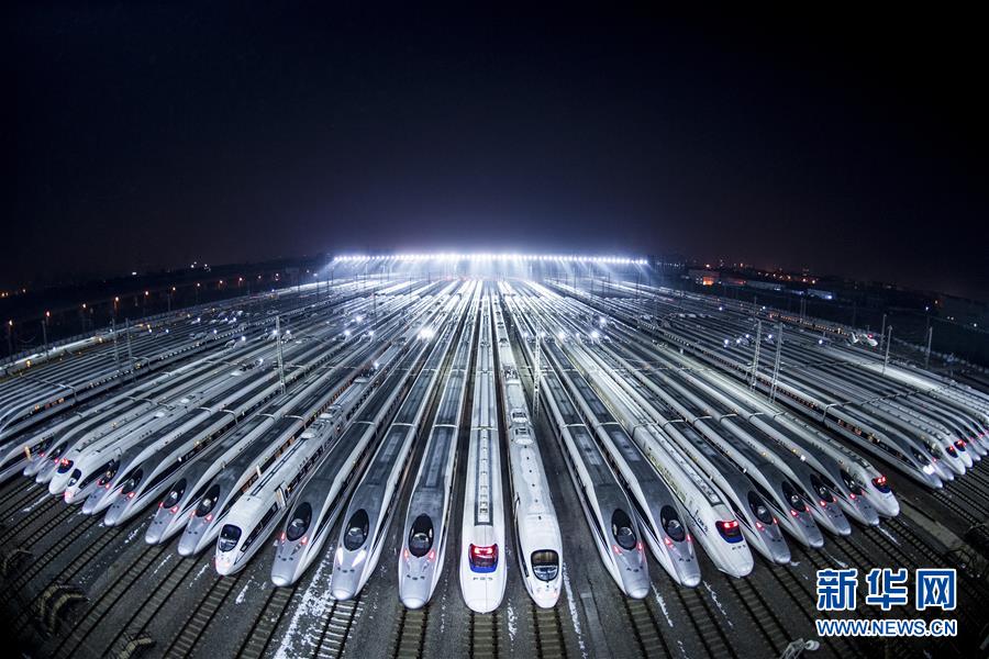 2018年2月1日凌晨,動(dòng)車組停靠在武漢動(dòng)車段的存車線上,準(zhǔn)備進(jìn)行檢修和保溫作業(yè)。近百組在武漢動(dòng)車段經(jīng)過檢修、保溫作業(yè)的動(dòng)車組蓄勢(shì)待發(fā),迎接春運(yùn)。新華社記者 肖藝九 攝