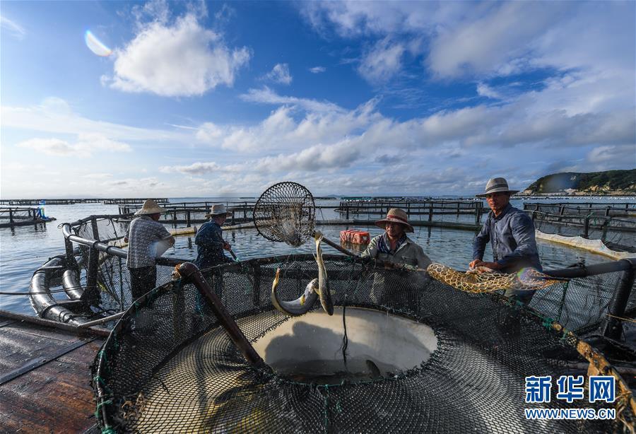 8月18日,南麂島海域內(nèi)的“海上牧場”養(yǎng)殖區(qū)內(nèi),漁民正捕撈大黃魚,處于仿生養(yǎng)殖環(huán)境的大黃魚需要生長2至3年。進入8月,浙江省溫州市平陽縣南麂鎮(zhèn)海域上大片的大黃魚、貽貝等特色海產(chǎn)品養(yǎng)殖區(qū)域迎來豐收季節(jié),養(yǎng)殖戶們駕駛漁船在養(yǎng)殖區(qū)海域進行打撈收獲,在碧海藍天下構(gòu)成了一幅“海上牧場”的美麗豐收景象。近年來,南麂鎮(zhèn)政府引導漁民養(yǎng)殖戶充分發(fā)揮“靠海吃?!钡馁Y源優(yōu)勢,大力發(fā)展海洋養(yǎng)殖經(jīng)濟和海島旅游經(jīng)濟,實現(xiàn)了南麂由“生態(tài)美”向“產(chǎn)業(yè)美”,“產(chǎn)業(yè)美”向“經(jīng)濟美”的轉(zhuǎn)變。同時該鎮(zhèn)堅持以大黃魚、貽貝等為特色產(chǎn)業(yè)支撐,精準發(fā)展高效海洋養(yǎng)殖業(yè),重點培養(yǎng)一批新型職業(yè)漁民,依靠專業(yè)技術(shù)支持,實現(xiàn)深海仿生養(yǎng)殖,讓好生態(tài)造就好品質(zhì),重點打造南麂養(yǎng)殖品牌,組建營銷網(wǎng)絡,拓展特色海產(chǎn)品市場。新華社記者 徐昱攝