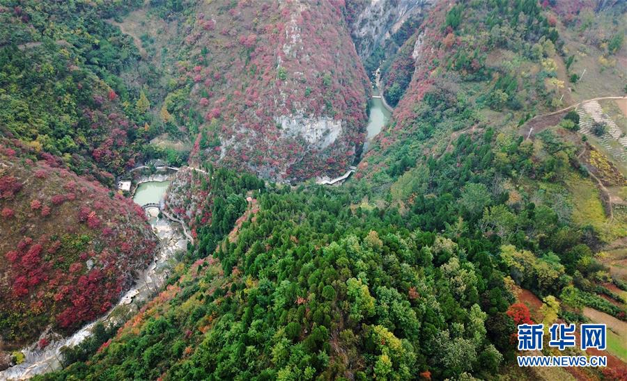 這是西狹頌景區(qū)秋景(10月16日無人機拍攝)。 新華社記者 陳斌 攝