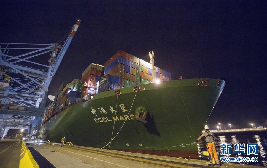 10月15日晚,中遠(yuǎn)海運(yùn)旗下的“中海火星”號(hào)集裝箱輪??吭诒壤麜r(shí)澤布呂赫港集裝箱碼頭。