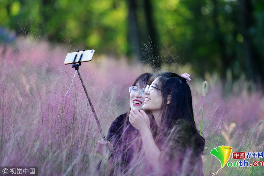中國(guó)青年網(wǎng)北京10月7日電 2018年10月6日,游客在“粉色田野”里游玩、留影。粉黛亂子草是一種觀賞草種,該植物夏季為主要生長(zhǎng)季,全株綠色,花期為9月中旬至11月中旬,開花時(shí),綠葉為底,粉紫色花穗如發(fā)絲從基部長(zhǎng)出,遠(yuǎn)看如紅色云霧。