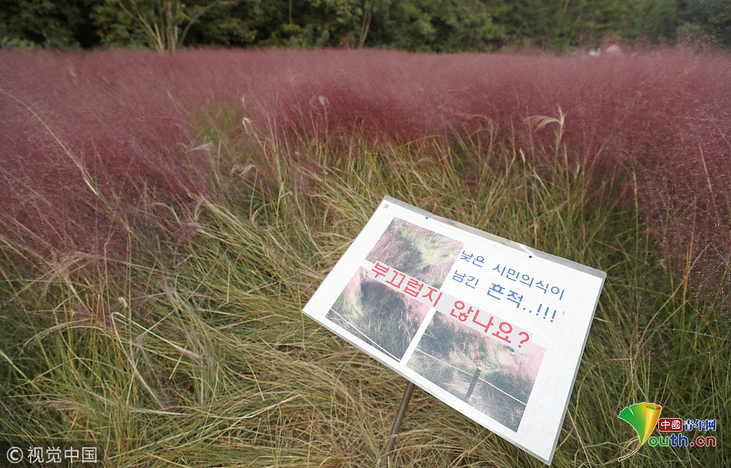 韓國(guó)蔚山,近日,蔚山公園大片粉黛亂子草盛開,但部分花海遭游客隨意踩踏。公園并沒有修復(fù)遭破壞區(qū)域,而是用繩索圍起并掛上批判性告示,呼吁游客腳下留情。圖片作者:Yonhap News Agency