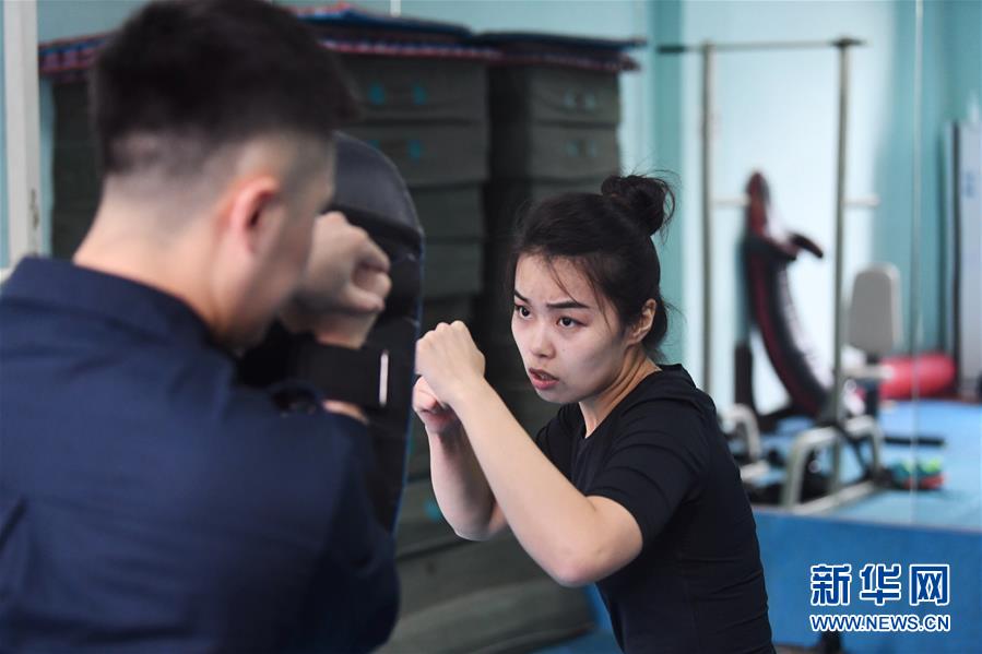 10月16日,湯春燕在健身房內進行擒敵訓練。