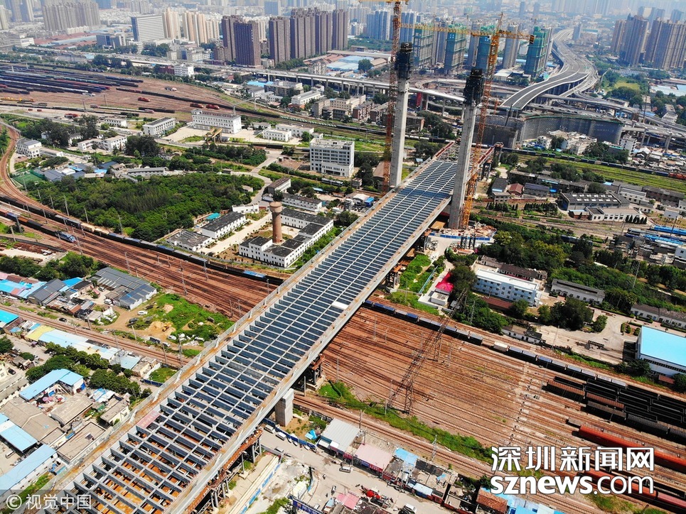 在橋梁頂推的同時,設(shè)計高度為150米的主塔也在不斷“長高”,目前高度為130米。“主塔在橋梁南北兩側(cè)各有一個,均為每次(8~10天)升高6米?!遍Z斌說,主塔預(yù)計在9月中旬澆筑到位,10月份將安裝斜拉索。