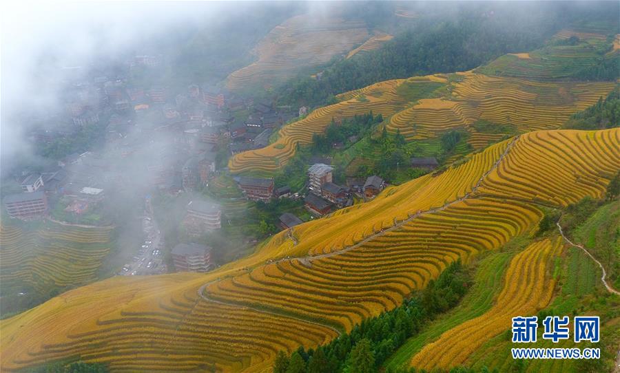 這是10月16日無人機(jī)拍攝的龍脊梯田秋色。金秋時節(jié),廣西龍勝各族自治縣龍脊梯田美如畫卷。 新華社記者 黃孝邦 攝