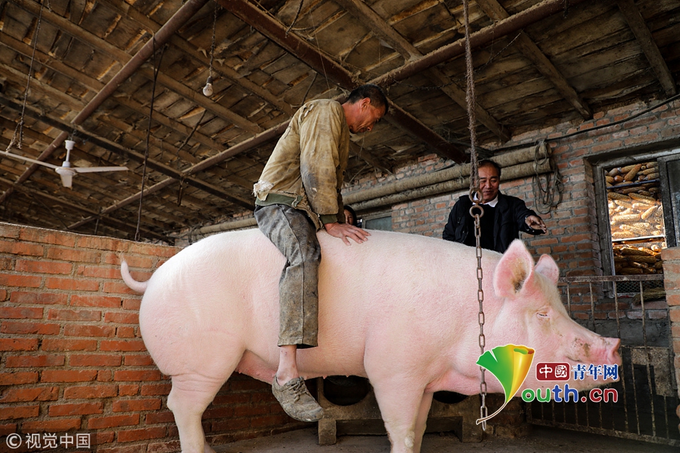 2018年10月16日,遼寧丹東,900斤重的大豬,堪稱豬中巨無霸,豈不是炙手可熱的網(wǎng)紅一枚?大小老板還不得帶上銀子蜂擁而至?然而,今年不行了,受遼寧多地豬瘟疫情影響,900斤大豬無人問津。本想靠著這頭巨無霸大豬刷爆朋友圈甚至賣個(gè)大價(jià)錢的養(yǎng)豬人張先生,現(xiàn)在非常擔(dān)心一頭好豬爛在手上。10月16日,遼寧丹東。當(dāng)著來圍觀的鄉(xiāng)親的面,養(yǎng)豬人張先生小心翼翼地騎上了豬背,希望用這樣的造型求關(guān)注。