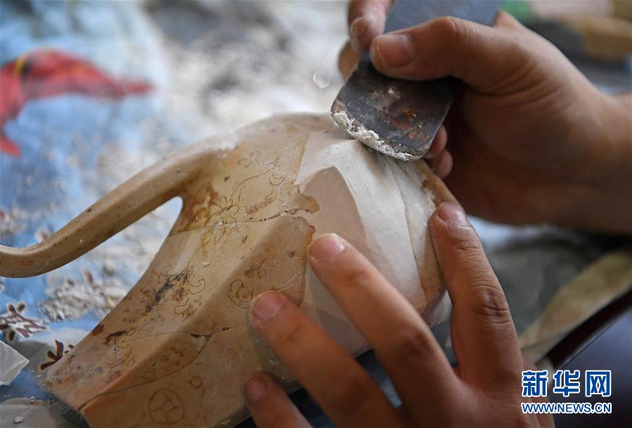 10月18日,在江西景德鎮(zhèn),工作人員修復一件瓷器。 新華社記者 萬象 攝
