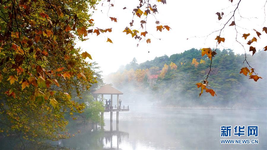 當(dāng)日,位于江西省九江市廬山風(fēng)景區(qū)內(nèi)的如琴湖云霧繚繞,層林盡染,吸引眾多游客前來(lái)觀賞游玩。