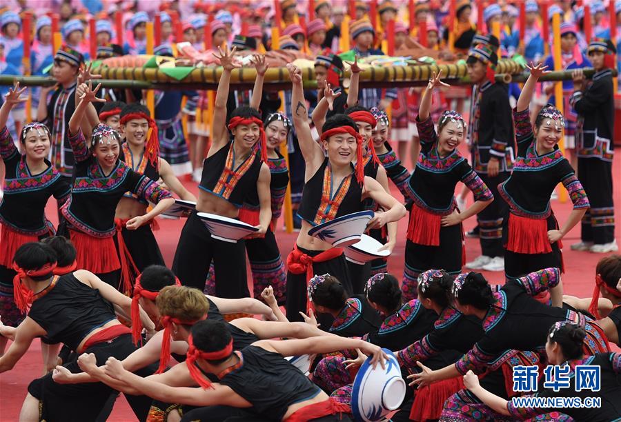 10月20日,各族同胞在廣西大化瑤族自治縣江濱文化廣場(chǎng)表演節(jié)目,慶??h慶。