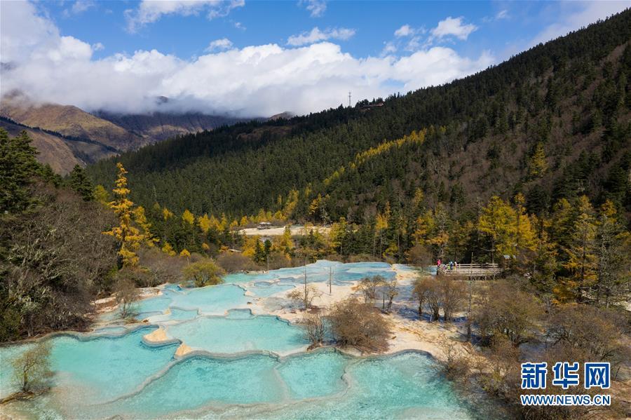 藍天白云與彩林、彩池構成一幅美麗畫卷(10月19日無人機拍攝)。深秋時節(jié),在雪山、藍天、白云和彩林映襯下,黃龍溝中的彩池色彩更加斑斕,目前黃龍景區(qū)進入觀賞最佳時節(jié)。黃龍風景名勝區(qū)位于四川省松潘縣境內(nèi),以彩池、灘流、雪山、峽谷、森林等聞名,享有“人間瑤池”“圣地仙境”之美譽。新華社記者 江宏景攝