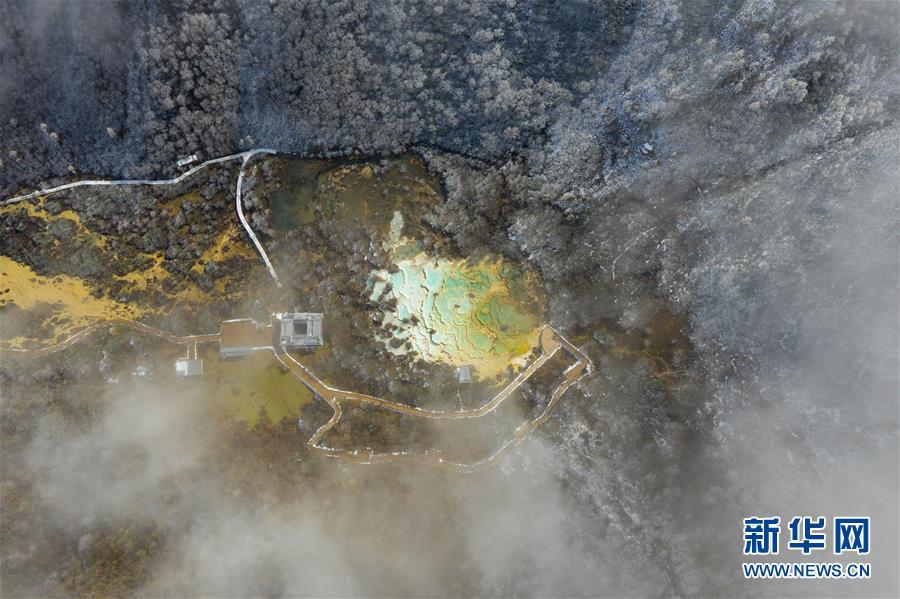俯瞰黃龍溝五彩池和黃龍寺(10月19日無(wú)人機(jī)拍攝)。深秋時(shí)節(jié),在雪山、藍(lán)天、白云和彩林映襯下,黃龍溝中的彩池色彩更加斑斕,目前黃龍景區(qū)進(jìn)入觀賞最佳時(shí)節(jié)。黃龍風(fēng)景名勝區(qū)位于四川省松潘縣境內(nèi),以彩池、灘流、雪山、峽谷、森林等聞名,享有“人間瑤池”“圣地仙境”之美譽(yù)。新華社記者 江宏景攝