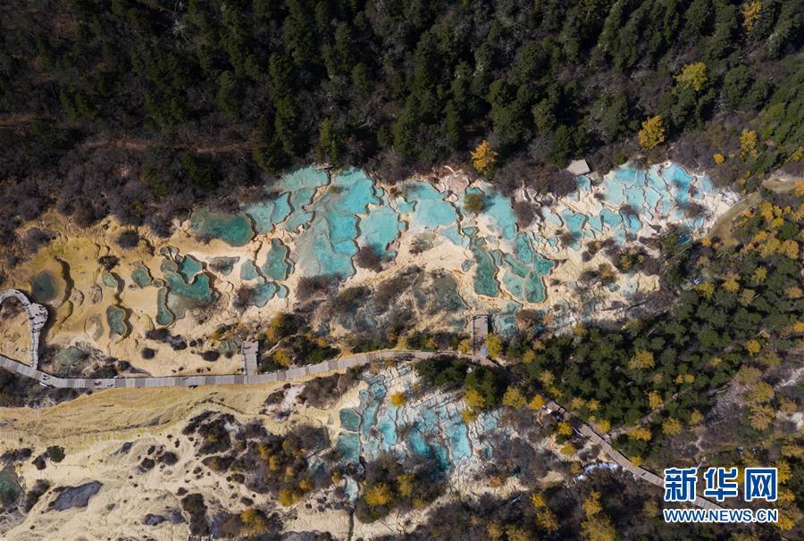 俯瞰黃龍溝爭艷池一角(10月19日無人機(jī)拍攝)。深秋時節(jié),在雪山、藍(lán)天、白云和彩林映襯下,黃龍溝中的彩池色彩更加斑斕,目前黃龍景區(qū)進(jìn)入觀賞最佳時節(jié)。黃龍風(fēng)景名勝區(qū)位于四川省松潘縣境內(nèi),以彩池、灘流、雪山、峽谷、森林等聞名,享有“人間瑤池”“圣地仙境”之美譽(yù)。新華社記者 江宏景攝