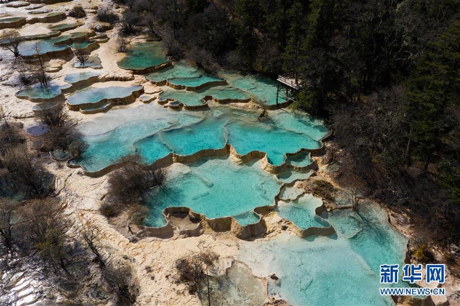 俯瞰黃龍溝爭艷池一角(10月19日無人拍機攝)。深秋時節(jié),在雪山、藍天、白云和彩林映襯下,黃龍溝中的彩池色彩更加斑斕,目前黃龍景區(qū)進入觀賞最佳時節(jié)。黃龍風(fēng)景名勝區(qū)位于四川省松潘縣境內(nèi),以彩池、灘流、雪山、峽谷、森林等聞名,享有“人間瑤池”“圣地仙境”之美譽。新華社記者 江宏景攝