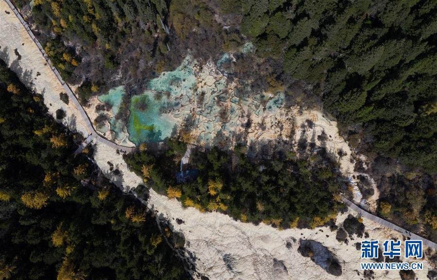 俯瞰黃龍溝盆景池(10月19日無(wú)人機(jī)拍攝)。深秋時(shí)節(jié),在雪山、藍(lán)天、白云和彩林映襯下,黃龍溝中的彩池色彩更加斑斕,目前黃龍景區(qū)進(jìn)入觀賞最佳時(shí)節(jié)。黃龍風(fēng)景名勝區(qū)位于四川省松潘縣境內(nèi),以彩池、灘流、雪山、峽谷、森林等聞名,享有“人間瑤池”“圣地仙境”之美譽(yù)。新華社記者 江宏景攝