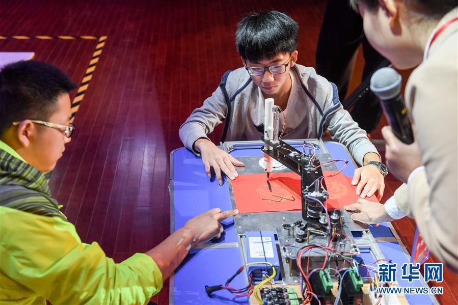 10月21日,在位于安徽合肥的中國(guó)科學(xué)技術(shù)大學(xué),“人五成影”隊(duì)帶著皮影戲機(jī)器人參加比賽。新華社記者張端攝