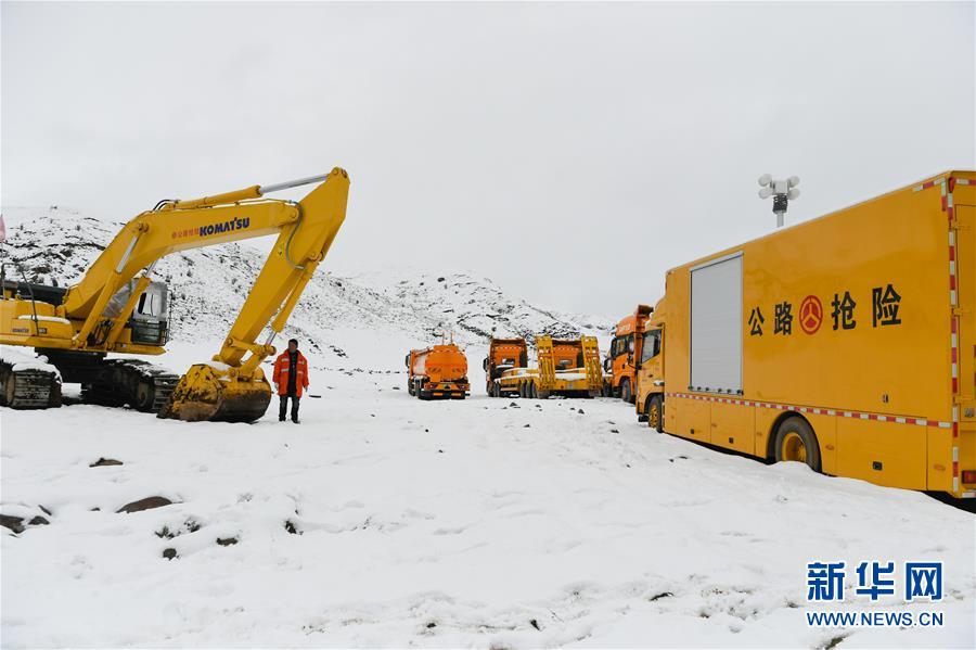 工作人員駕駛大型機(jī)械在昌都市江達(dá)縣的高山牧場(chǎng)上搶通道路(10月14日攝)。新華社記者 劉東君 攝