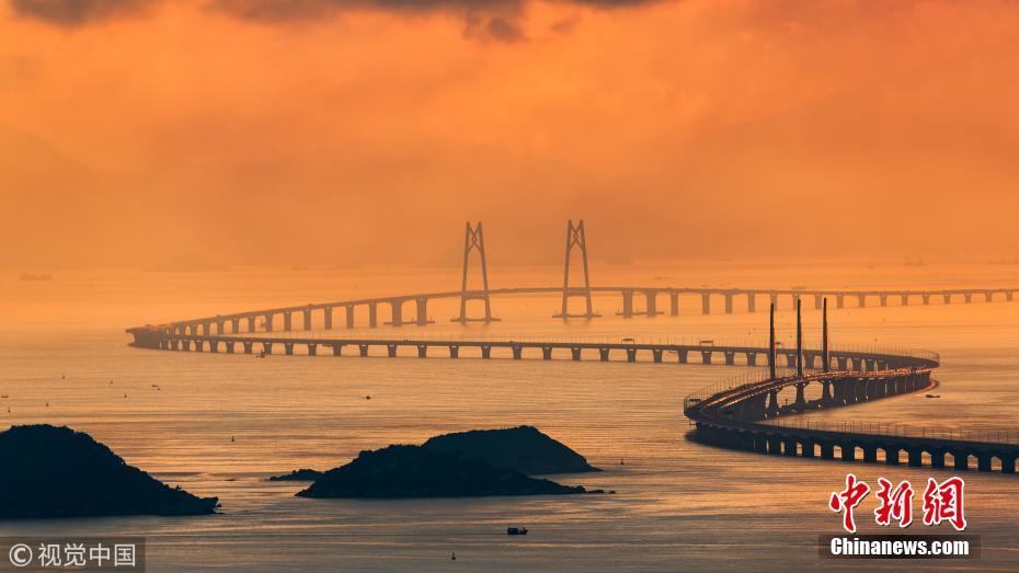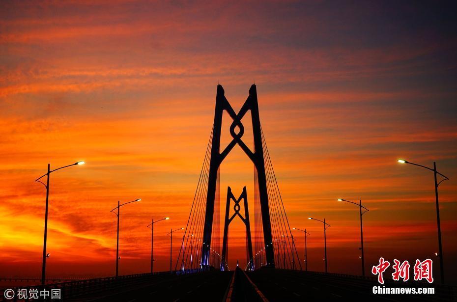 2018年7月18日,珠海,滿天紅霞,亮燈后的港珠澳大橋跨立在伶仃洋上,進(jìn)入通車前的最后準(zhǔn)備。張由瓊 攝 圖片來(lái)源:視覺(jué)中國(guó)