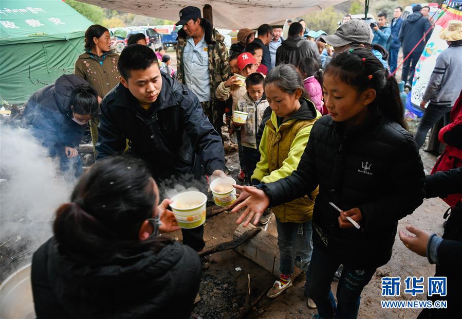 波羅鄉(xiāng)工作人員在臨時過渡安置點內(nèi)為波羅鄉(xiāng)第一小學學生盛晚飯(10月14日攝)。 新華社記者 劉東君 攝