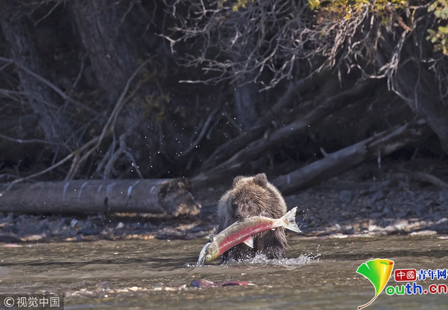 2018年10月29日訊(具體拍攝時間不詳),加拿大英屬哥倫比亞,一只15個月大的棕熊幼崽在Chilko Lake湖畔成功捉到一只4公斤重的紅色鮭魚。