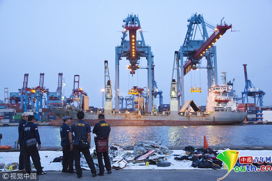 搜救人員打撈上來(lái)飛機(jī)的殘骸。