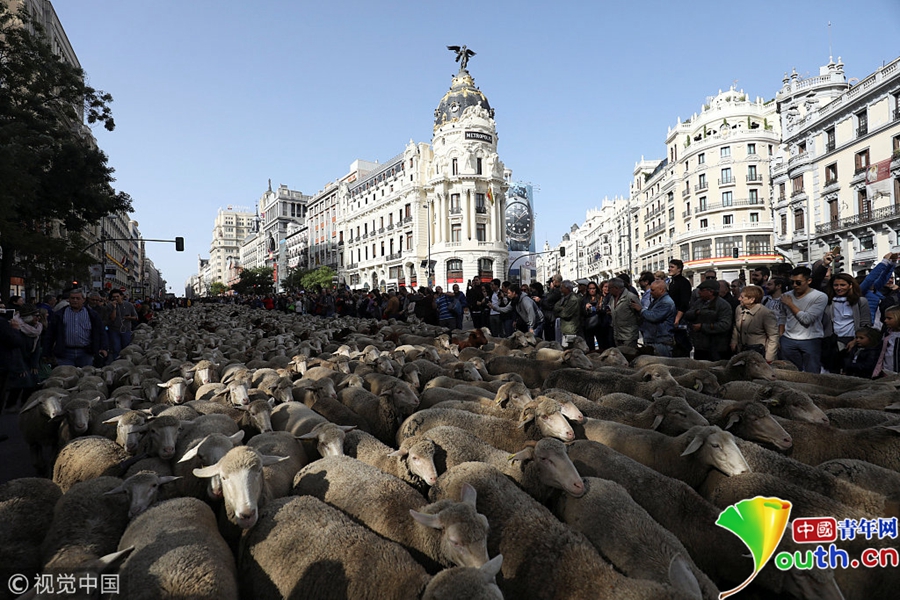 西班牙牧羊人驅(qū)趕羊群穿越馬德里 羊群進城“參觀”