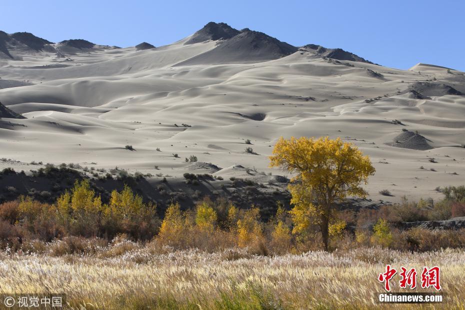 大片的胡楊樹葉由綠變黃,一眼望去,陽光下金色的樹葉襯著湛藍(lán)的天空于風(fēng)中婆娑起舞。