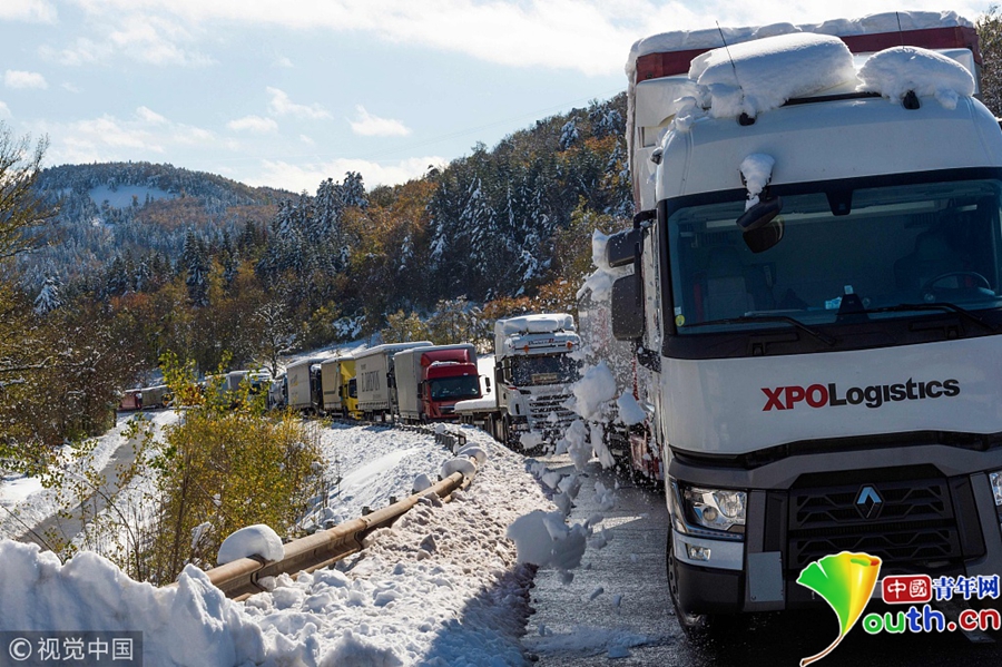 當?shù)貢r間2018年10月30日,法國菲克斯圣熱內,當?shù)赝唤荡笱?,導?50人被困在大雪覆蓋的公路上,不得不睡在緊急救援中心。法國國家氣象局已經(jīng)將當?shù)刂糜诔壬踩渲隆?/p>