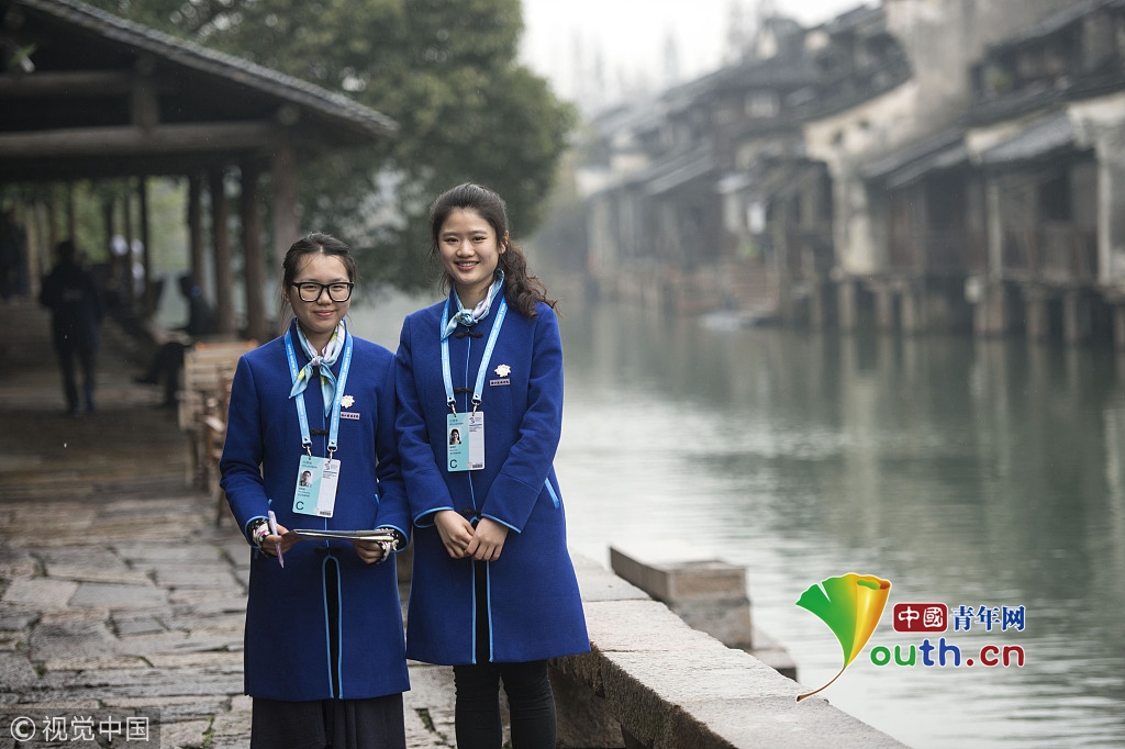 2015年12月13日,浙江嘉興,桐鄉(xiāng)烏鎮(zhèn)景區(qū),引導(dǎo)志愿者著裝上崗,她們將在景區(qū)各個(gè)站點(diǎn)開展引導(dǎo)咨詢服務(wù)。