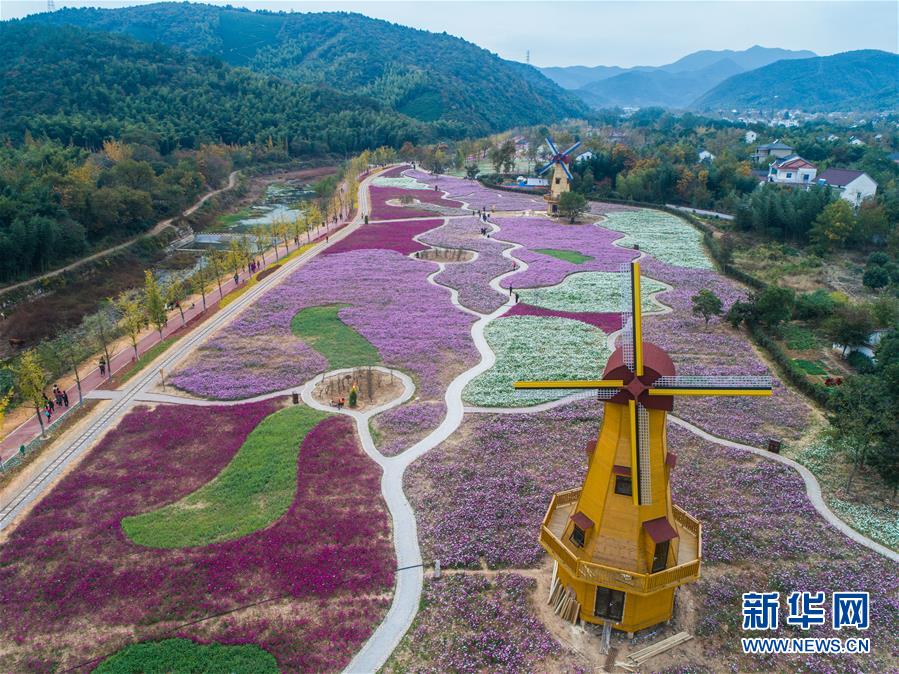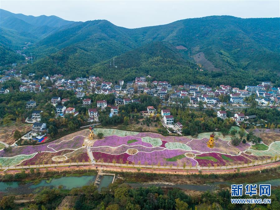 11月2日,空中俯瞰小浦鎮(zhèn)的“五彩花?!?,多彩的花海與金黃的銀杏林構(gòu)成了一幅美麗的秋季風景(無人機拍攝)。 新華社記者 徐昱 攝