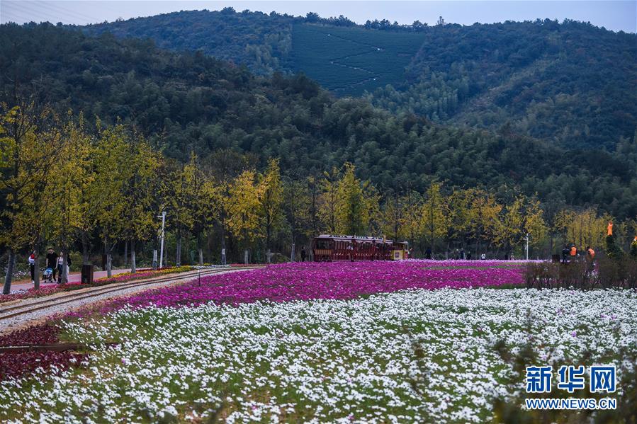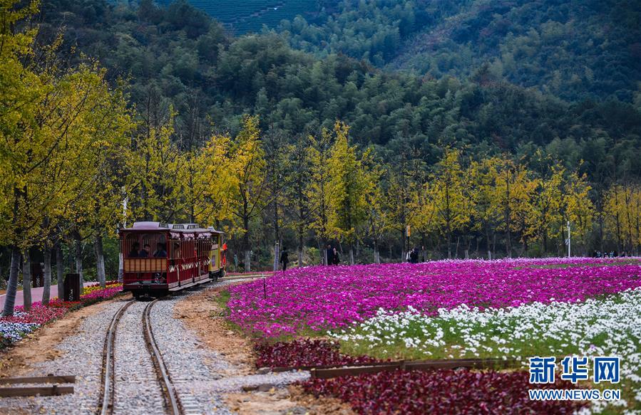 11月2日,游客乘坐觀光小火車觀賞“五彩花?!保o人機拍攝)。