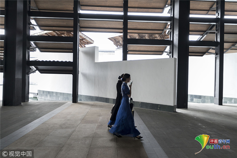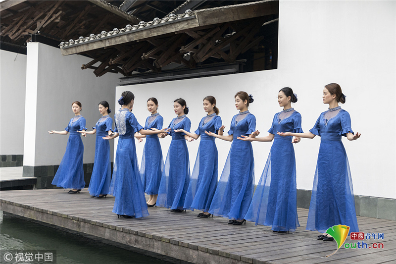 2014年11月17日,世界互聯(lián)網(wǎng)大會(huì)直播演練在浙江烏鎮(zhèn)舉行。來(lái)自浙江傳媒學(xué)院的大學(xué)生們,身著一襲青花瓷紋旗袍亮相,顯得分外嫵媚,引人注目。