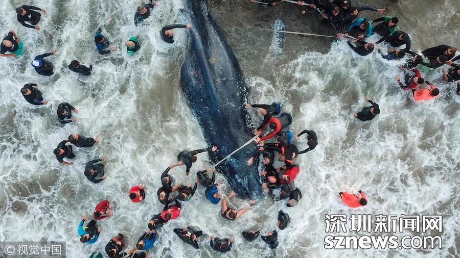 當(dāng)?shù)貢r間2018年4月9日,阿根廷馬德普拉塔,一條鯨魚在當(dāng)?shù)睾R淺,雖經(jīng)民眾合力救助仍最終死亡。