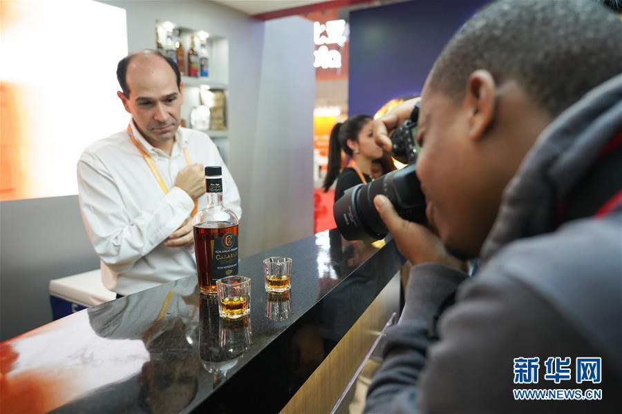 11月7日,在委內(nèi)瑞拉展區(qū),一名參觀者拍攝當?shù)厣a(chǎn)的朗姆酒。 中國國際進口博覽會11月5日在上海開幕。國家貿(mào)易投資綜合展(國家展)是中國國際進口博覽會的重要內(nèi)容,共有82個國家、3個國際組織設(shè)立71個展臺。 新華社記者 王天聰 攝