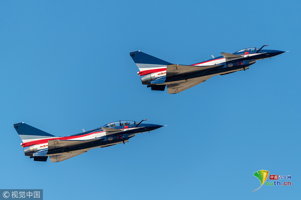 圖六:2018年11月6日,廣東珠海航展上,兩架八一飛行表演隊的殲-10A飛機(jī)。