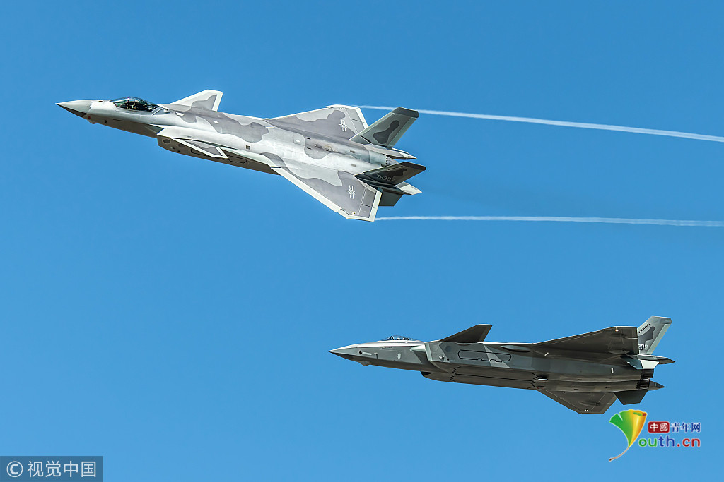 圖五:2018年11月6日,廣東珠海航展上,兩架殲-20戰(zhàn)機組成雙機編隊進行飛行表演。