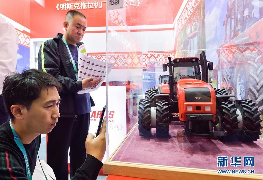 11月7日,參觀者在拍攝、觀看白俄羅斯明斯克拖拉機廠的拖拉機模型。 新華社記者 李賀 攝