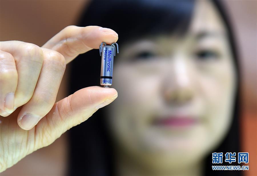 11月8日,在進博會醫(yī)療器械及醫(yī)藥保健展區(qū)美敦力公司展臺,工作人員在展示全球最小的心臟起搏器。新華社記者 韓瑜慶 攝