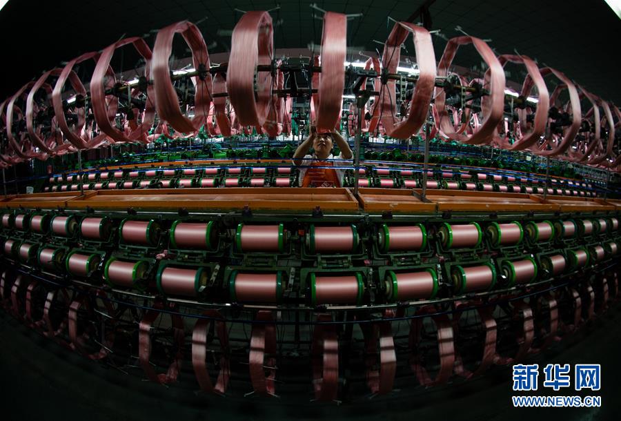 蘇州市吳江區(qū)盛澤鎮(zhèn)一家絲綢公司的工人在車間進行絡(luò)絲作業(yè)(2017年5月20日攝)。 新華社記者 李響 攝