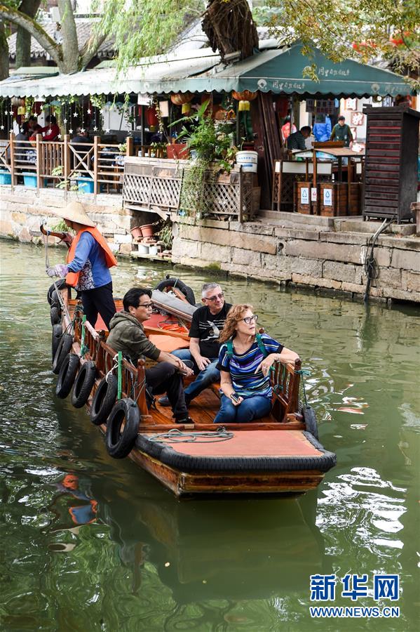 游客們?cè)谔K州市吳江區(qū)同里古鎮(zhèn)乘船游玩(10月31日攝)。 新華社記者 李博 攝