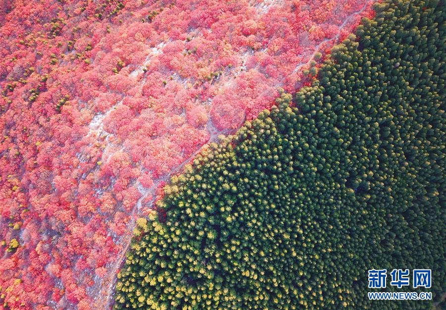 深秋時(shí)節(jié),山東濟(jì)南楔子山山脊兩邊種植的植被形成“一山雙色”景觀,令人稱奇。