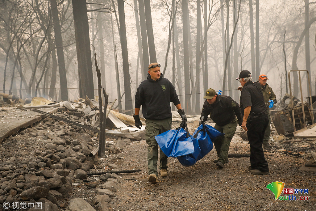 11月13日,在美國(guó)加利福尼亞州天堂鎮(zhèn),搜救人員在山火過(guò)后的廢墟工作。