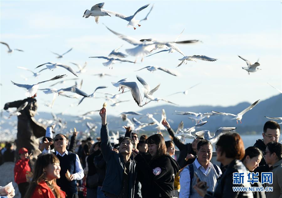 11月14日,人們在昆明滇池邊觀賞紅嘴鷗?! ⌒氯A社記者 藺以光 攝