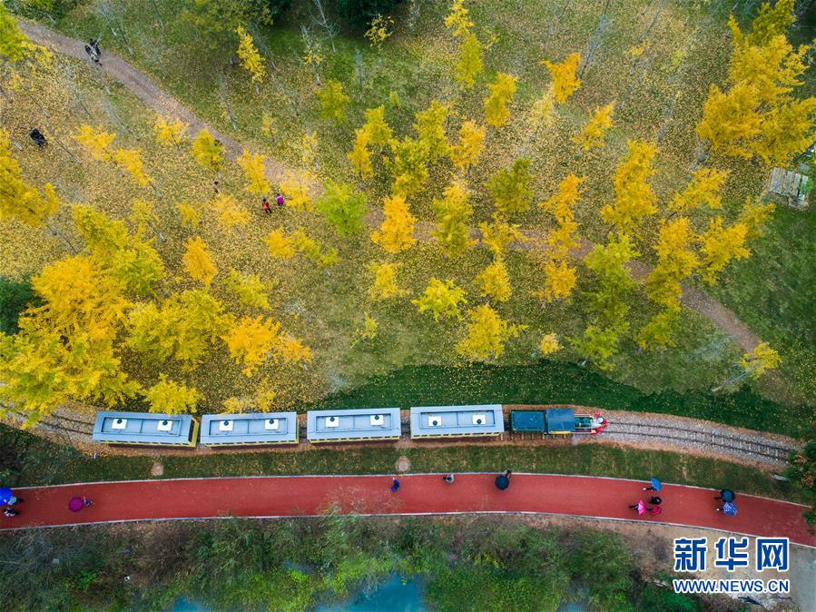 一列觀光小火車帶著游客穿行在銀杏林和花海之間(11月16日無人機拍攝)。近日,在浙江省長興縣小浦鎮(zhèn),“十里銀杏長廊”和近千畝花海經(jīng)過近一年的升級改造后,以嶄新的面貌與游客見面?;ê?、觀光小火車、古村民宿、銀杏長廊等旅游項目全面提升了小浦鎮(zhèn)鄉(xiāng)村旅游的品質(zhì)。新華社記者 徐昱 攝