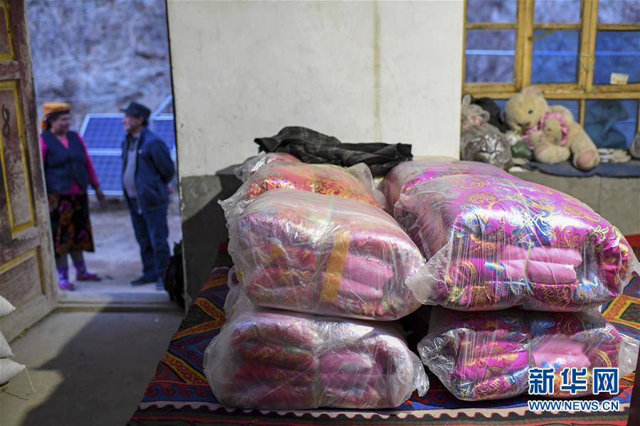 在塔什庫爾干塔吉克自治縣大同鄉(xiāng)阿克托尕欄桿村一組都熱的舊居中,新縫制好的12床被子放在屋內,都熱·加爾曼(右)和妻子在門口談論搬遷安排(11月16日攝)。新華社記者胡虎虎攝