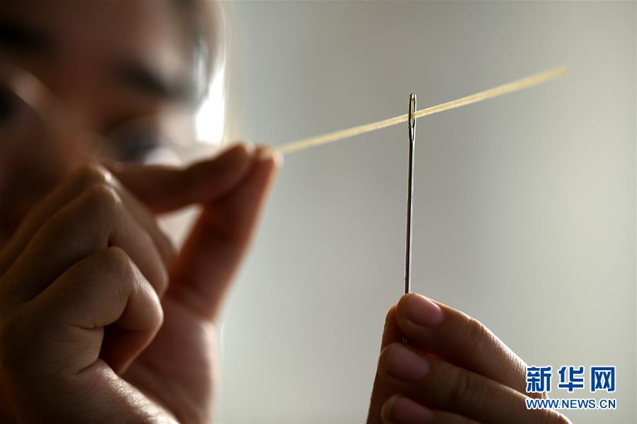 11月23日,在石家莊市藁城區(qū)耿家莊村某宮面生產廠,工人演示用藁城宮面穿過縫針眼。