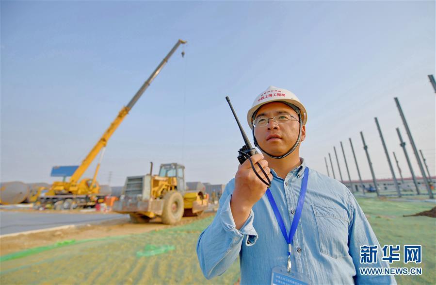 4月26日,來自中鐵上海工程局京雄城際鐵路五標二分部的工程師韓正順在京雄城際鐵路工程五標段小型構(gòu)件預制廠場地建設(shè)現(xiàn)場用對講機指揮作業(yè)。新華社記者王曉 攝 圖片來源:新華網(wǎng)