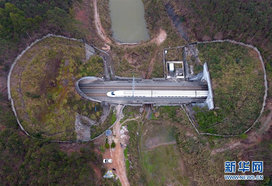 一列動車穿越南寧郊區(qū)一處隧道(2月11日無人機拍攝)。 廣西壯族自治區(qū)成立60年來,鐵路建設(shè)發(fā)生翻天覆地的變化。來自中國鐵路南寧局集團有限公司的數(shù)據(jù)顯示,1958年廣西鐵路總里程為1346.3公里,如今廣西鐵路總里程達(dá)5191公里。廣西與周邊相鄰省份間實現(xiàn)動車“公交化”開行。此外,北部灣港—重慶班列、東盟海產(chǎn)品冷鏈班列、“百色一號”果蔬專列等的開通和運營,強化了鐵路供給的針對性和有效性。鐵路成為助推廣西經(jīng)濟社會快速發(fā)展的“大動脈”。 新華社記者陸波岸攝
