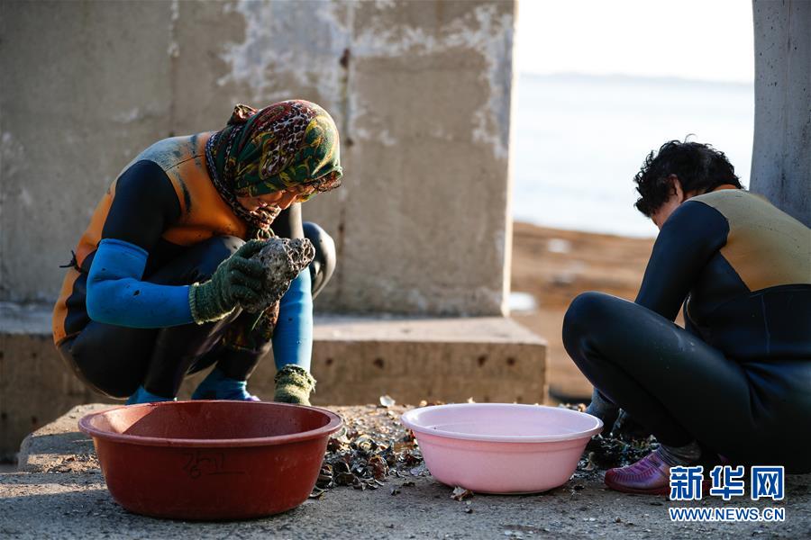 11月23日,海女們在韓國濟州島的一處海岸附近處理打撈出的海產品。新華社記者王婧嬙攝