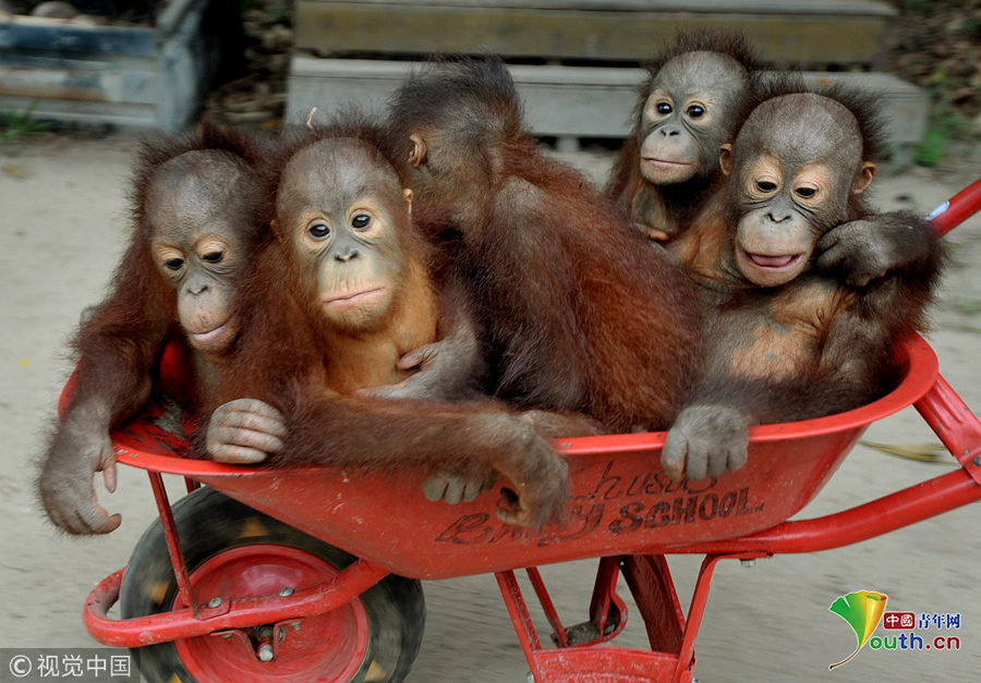 印尼加里曼丹克塔邦,國際動物救援(IAR)猩猩安全與保護中心里,飼養(yǎng)員用獨輪車把猩猩寶寶送到森林學校。圖片作者:Newscom